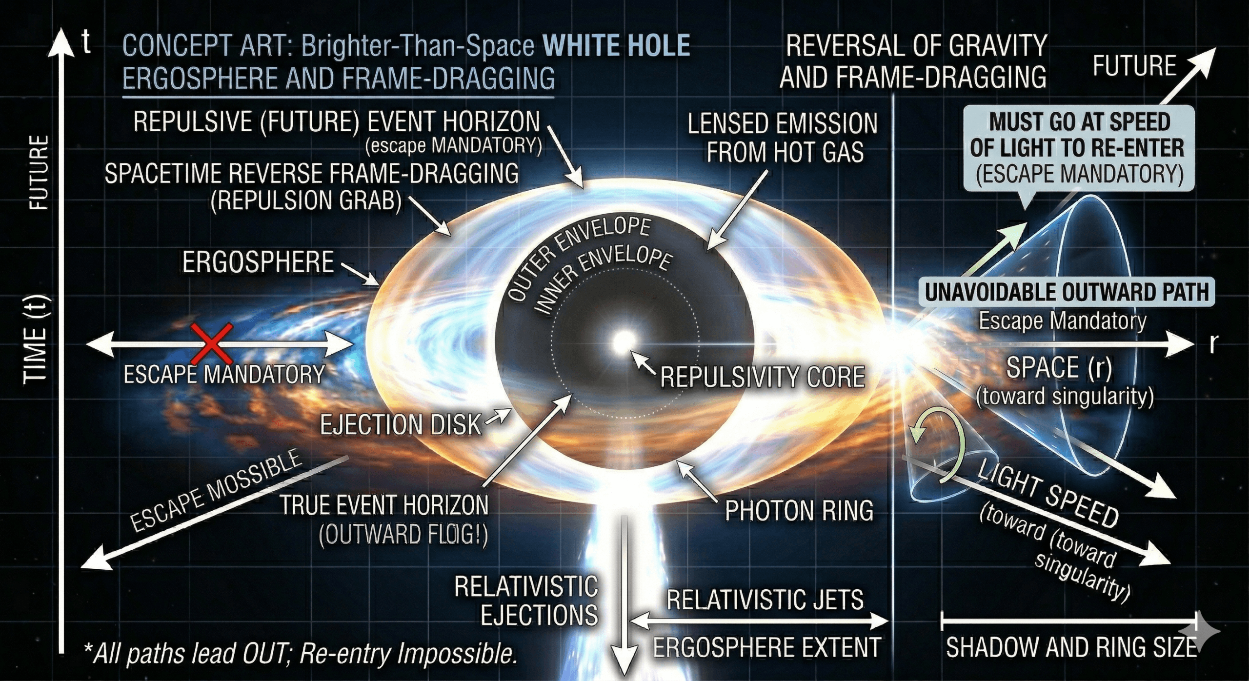 The white‑hole region is “in the past” of the external universe in a precise causal sense: signals can come from the white hole into the external region, but nothing in the external region can send a signal back into the white hole. In this framework, when one asks what is a white hole in space, the answer is purely geometric: it is a region whose causal structure forbids any in‑going signals from the outside.